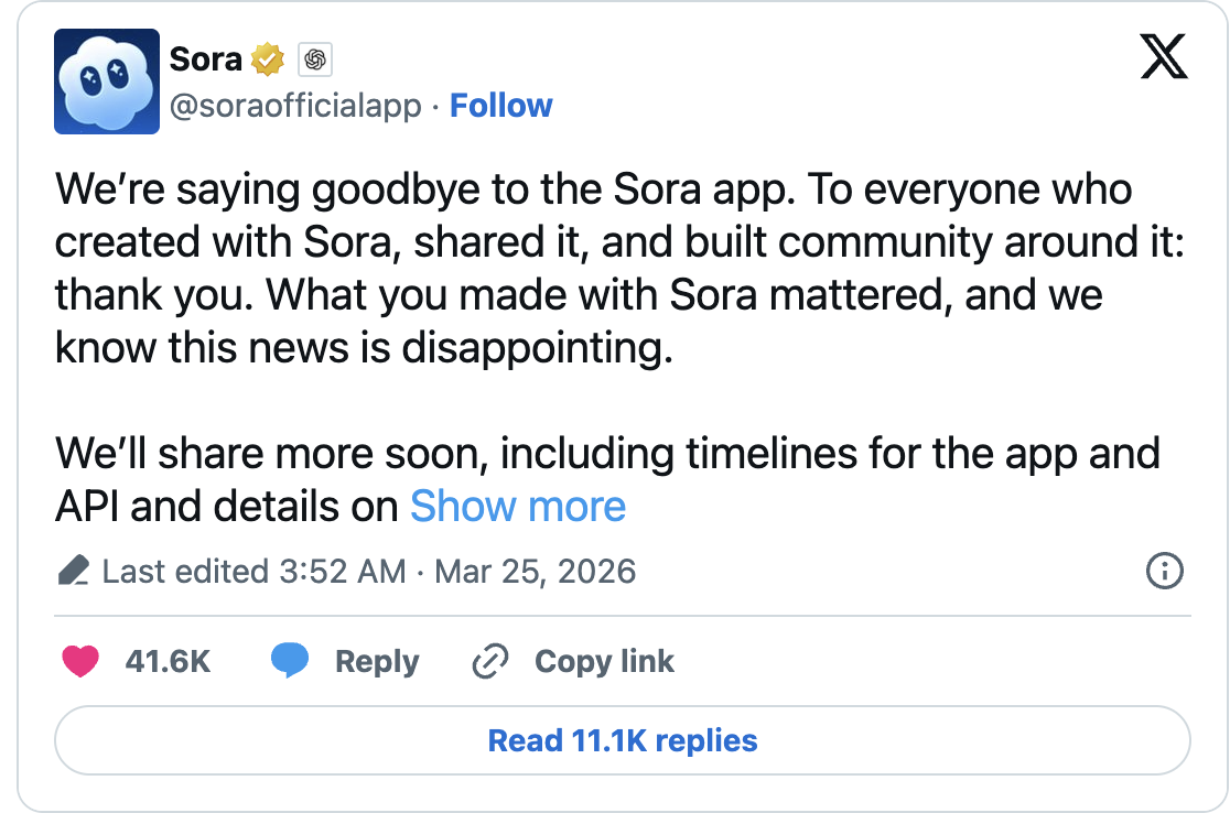 “We are no longer supporting the Sora app. Thank you to everyone who made it, shared it, and built a community around it. We know this news may be disheartening, but what you produced with Sora was important.