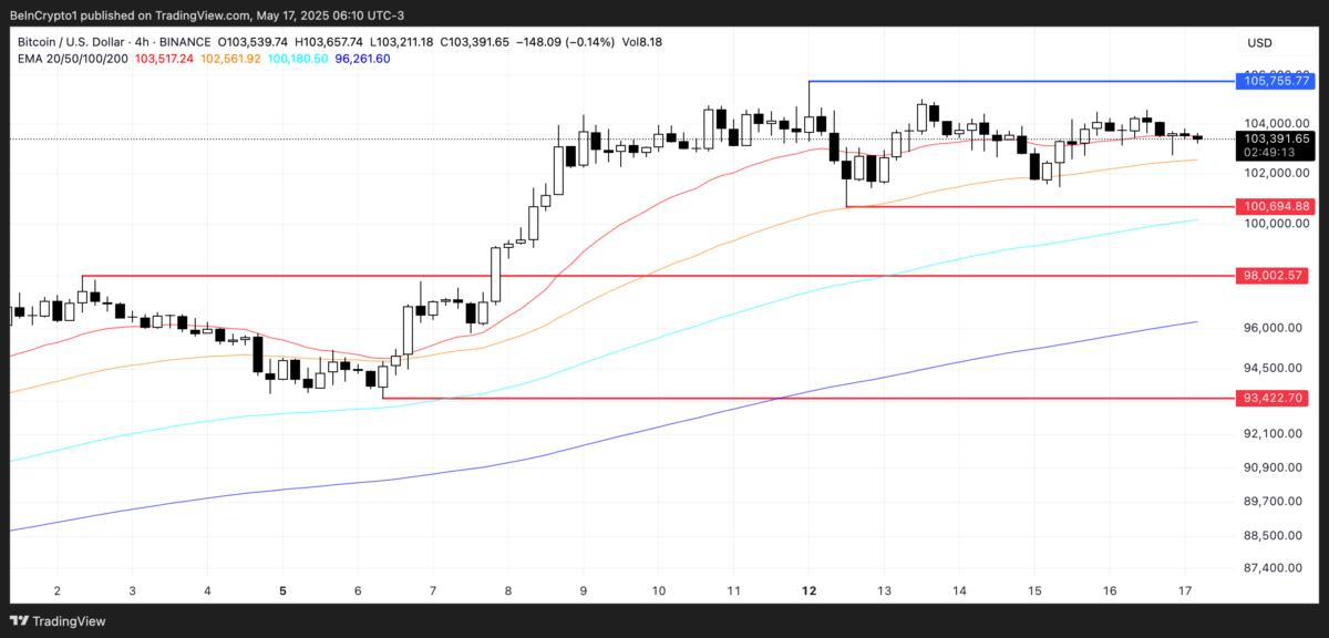Following its $100,000 mark, Bitcoin’s price stays in a holding pattern in the near term. Though the flattening of these averages points to a need for new catalysts, the optimistic EMA alignment signals possible for more gains.